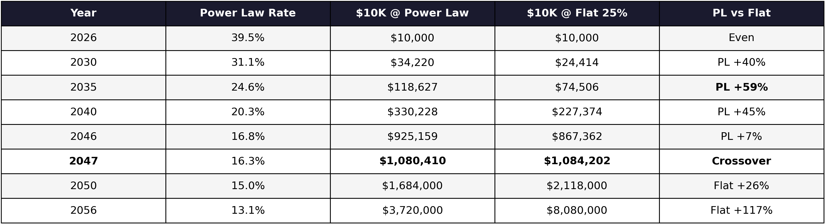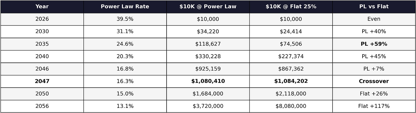The power law starts hotter โ nearly 40% in 2026 versus 25% flat โ and peaks at roughly 59% ahead of the flat assumption around 2035. Then it decelerates, the gap narrows, and by 2047 the flat 25% CAGR catches up entirely. After that, the flat assumption pulls ahead because it never slows down.