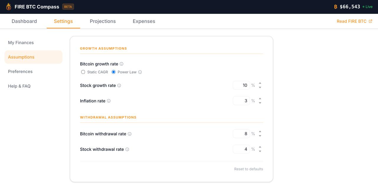 The BTC Growth toggle in the Compass settings is a calibration tool. It shows what your FIRE plan looks like under different growth assumptions so you can stress-test your own numbers. If you think the power law is a reasonable framework, toggle it on and run your projections. If you prefer the simplicity of a flat CAGR, keep using that. The flat rate mirrors what the traditional FIRE community uses for stocks: it assumes ongoing exponential growth at a steady rate, which is also an average that doesn't tell you the path the market will take to get there. The two approaches aren't that different in spirit.