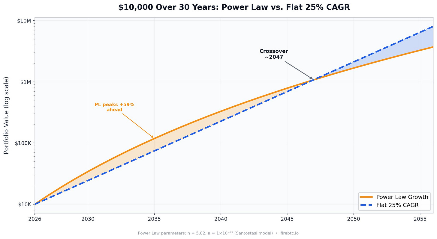 To make this concrete, I ran a 30-year comparison. Take $10,000 and grow it under two scenarios: the power law model (using the Compass's default parameters) versus a flat 25% CAGR: