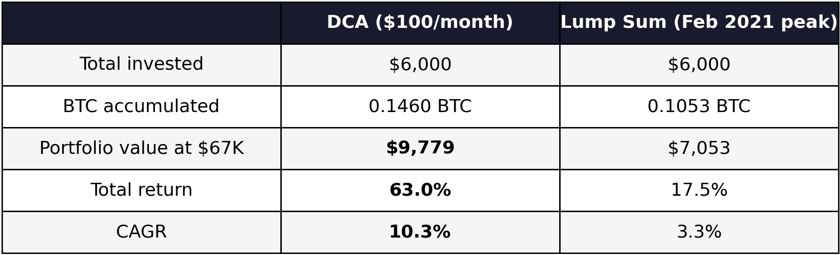 By the end of December 2022, the DCA buyer had invested $2,300 across 23 months and accumulated 0.07266 BTC โ a cost basis of $31,654. Well below the starting price. Well below what the lump-sum buyer paid. And sitting on a stack that, when bitcoin eventually recovered, would be priced in at a significant discount.