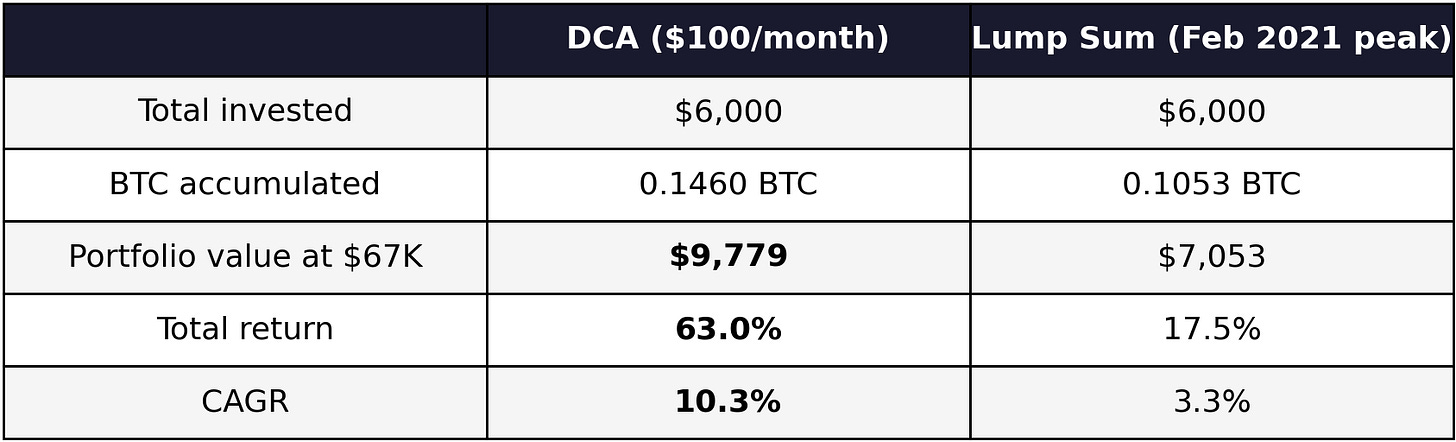 And here's what surprises most people: the DCA buyer's average cost basis is $41,109 per bitcoin โ lower than the February 2021 monthly close of $45,138, even though they were still buying through prices as high as $115,000 in July 2025. Every month of buying through the 2022 bear market dragged that cost basis down.